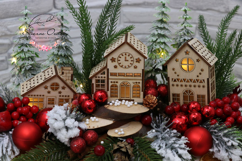 Zimowy stroik świąteczny z domkami i lampkami LED – czerwień & zieleń Zimowe Miasteczko