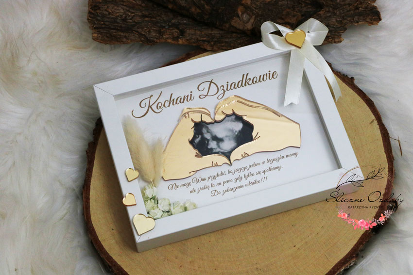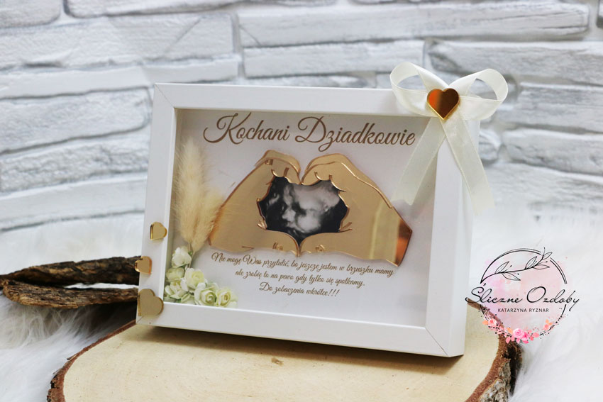 Nie wiesz jak przekazać tą niezwykłą wiadomość dla przyszłych dziadków, że jesteś w ciąży? Ta ramka to niezwykły, pełen subtelności sposób na przekazanie najpiękniejszej wiadomości. Zamknięta w niej treść „Zostaniecie Dziadkami” doprowadzi przyszłych dziadków do wzruszenia i rodzinnego ciepła. Złoty dodatki dłonie i symboliczne serce z miejscem na zdjęcie usg, pleksi podkreślają wyjątkowy charakter prezentu, tworząc pamiątkę, którą rodzice zachowają na lata a pierwszy dzień Babci i Dziadka staje się wyjątkowy.